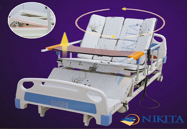 • Bô vệ sinh: Sử dụng tay gạt để điều khiển bô vệ sinh, một tấm đệm trên giường sẽ dần tụt xuống, cùng lúc giá bô dưới gầm giường chuyển động tịnh tiến vào. Bô và tấm đệm khoét lỗ chuyển động đều ngược chiều; sẽ dừng lại khi bô bao trọn lỗ khoét trên đệm. Bệnh nhân đi vệ sinh xong, điều khiển cho bô và đệm về vị trí ban đầu; sau đó đem chất thải đi đổ.
