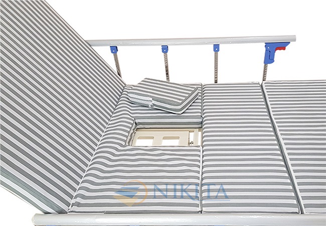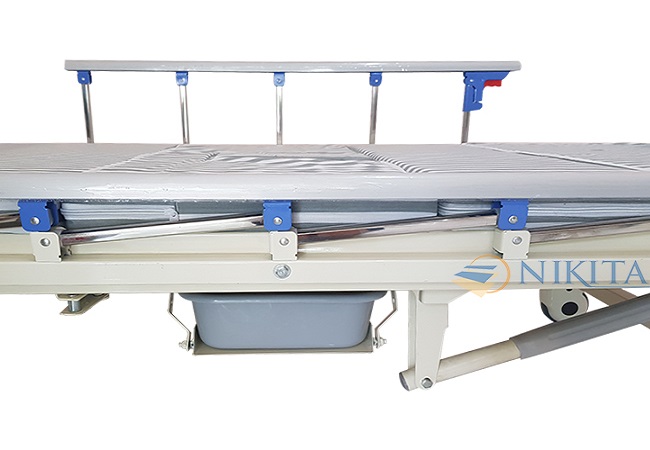 - Tay gạt: Giường bệnh thiết kế có tay gạt bô cho người bệnh đi vệ sinh ngay trên giường. Sử dụng tay gạt này 1 tấm đệm trên giường sẽ dần tụt xuống, cùng lúc giá bô dưới gầm giường chuyển động tịnh tiến vào.