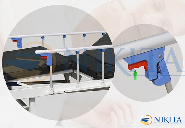 • Thanh chắn hai bên giường giúp bảo vệ người bệnh tránh bị rơi xuống đất. Ngoài ra, có thể gấp gọn đơn giản bằng cách ấn vào nút đỏ trên thành và gập lan can về phía trước.