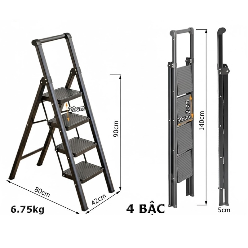 - + Thang ghế gấp gia đình được cấu tạo từ thép chất lượng cao dày 1mm, có khả năng chống mài mòn, chống trầy xước và không bị phai màu. Toàn bộ bàn đạp thang đều được nâng cấp lên cỡ 20cm giúp leo thang an toàn và ổn định hơn.