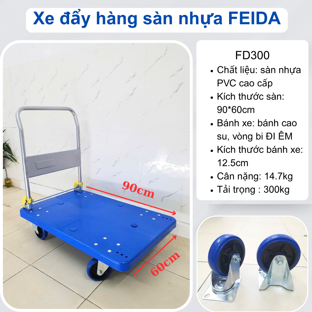 - Xe kéo hàng 4 bánh gấp gọn Feida FD-300 Chất liệu bền bỉ: Sàn nhựa PP chịu lực tốt, không bị gỉ sét, phù hợp sử dụng trong môi trường ẩm ướt hoặc kho lạnh.