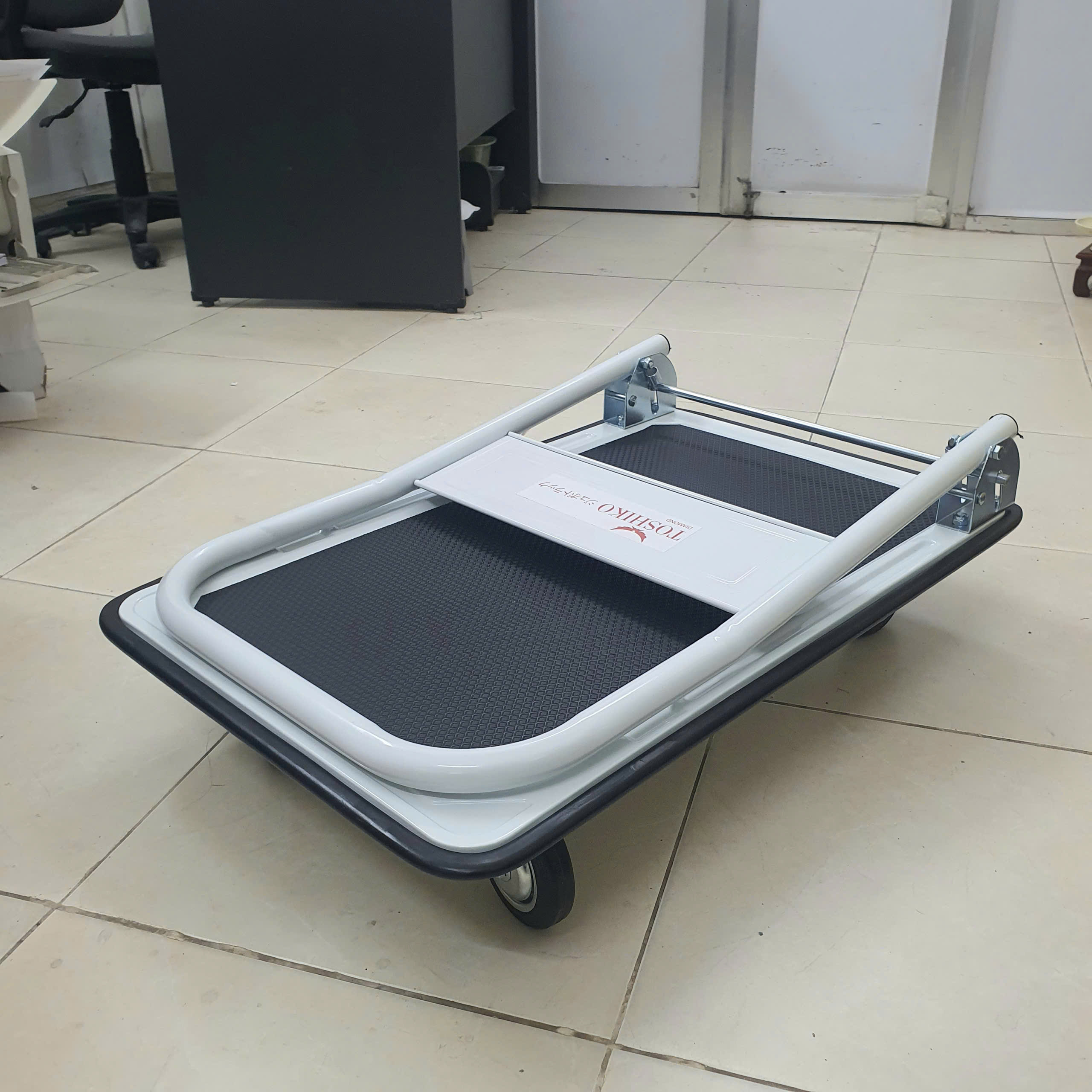 - Xe đẩy hàng TSK100 có bề mặt sàn thiết kế vân sần chống trơn trượt, đảm bảo an toàn cho hàng hóa khi vận chuyển.